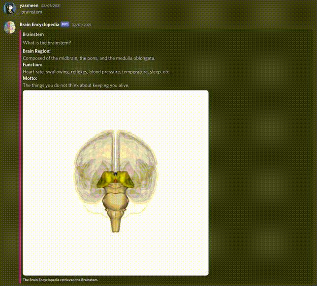 Bot retrieves labelled brain regions when a user types out its name in the chat server. The definition is visible to all the users in the channel for easy access and immediate learning feedback.